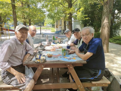 晴海通りを横断し北上、聖路加国際病院を見上げるあかつき公園に入り、村谷が下見していた6人掛けテーブルを確保した。