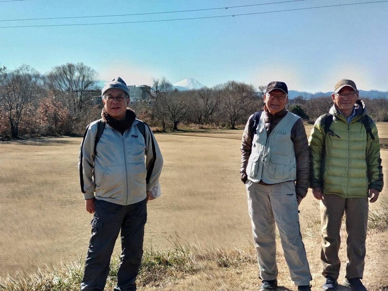 多摩川の土手に上がり、富士山を背に記念撮影を済ませて、腹ごなし散歩に出発。