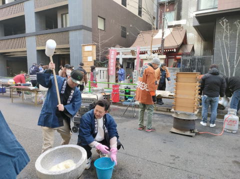 富澤稲荷神社の前で若者たち2組が2台の臼を囲んで餅つきの真っ最中。日本橋富沢町の新年会らしく、老若男女が集まっていて 道路全体をいくつものテーブルが占領中、すでにお弁当や一升瓶が並べられていた。