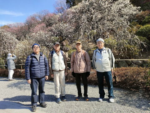 見晴台から見下ろすと二棟の茶室と和室があり、池や芝生などと絶好の組み合わせになっていた。座論梅(紅)など五種類の梅の花がお勧め。中でも村谷が今月のこあみ句会で詠んだ「思いのまま」は、確かに同じ木に紅白の花が同居していた。